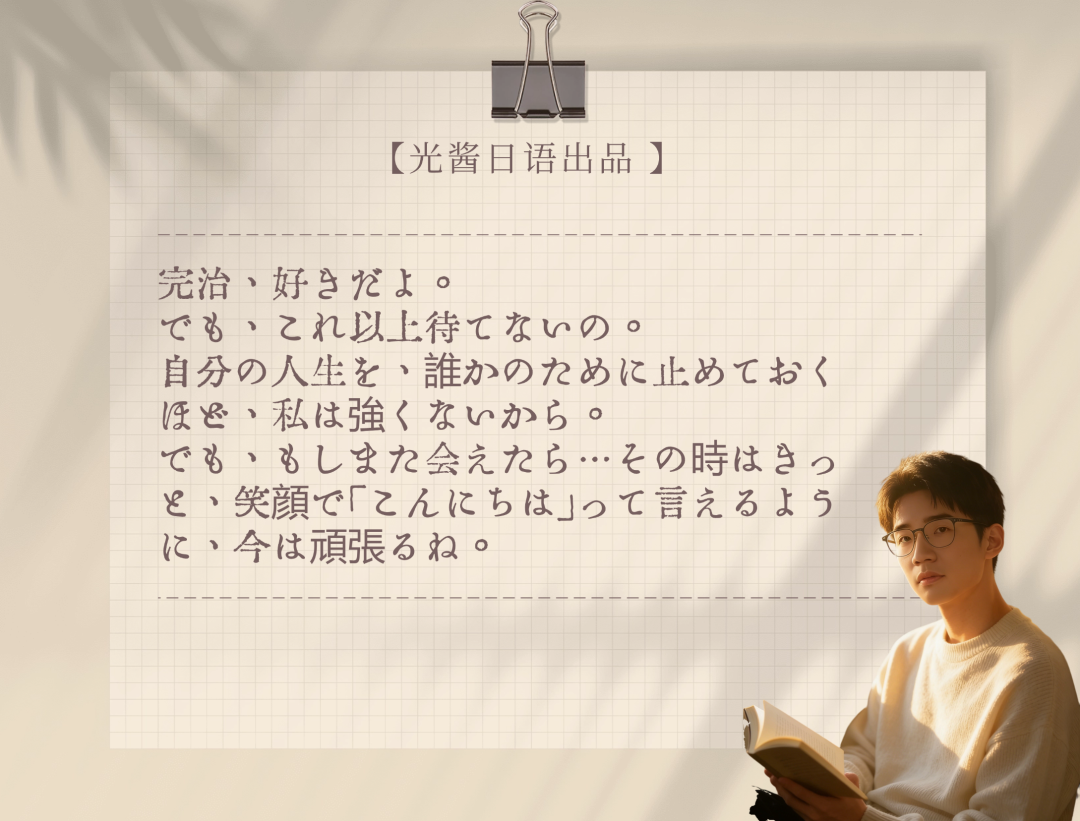 「我已无法」传达出一种无奈与决绝,而「再继续等待」则揭示了莉香内心的挣扎与疲惫。她并非不愿等待,而是已等待至极限,这份“无法再等”并非任性之举,而是感情消耗殆尽后的清醒认知。