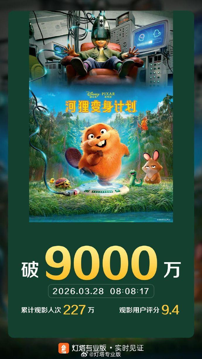 根据徽声在线从灯塔专业版获取的实时数据,截至3月28日早上8时8分,电影《河狸变身计划》的票房成绩已经成功突破9000万元大关,这一数字无疑为影片的后续表现注入了强劲动力。