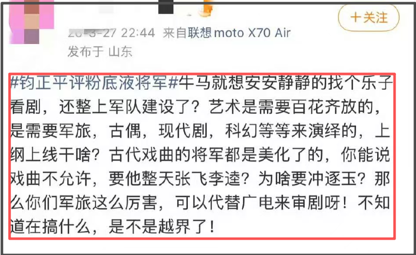 因此,由于“脂粉气过重、徒有其表缺乏内在”,该剧男主角被“钧正平”等权威官媒点名批评,戏称为“粉底液将军”。