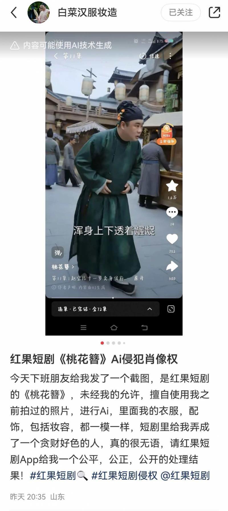 近日,网友“白菜”在社交媒体上发布了一篇长文,揭露了一部名为《桃花簪》的AI短剧在未经其许可的情况下,擅自使用了他的形象作为剧中角色,这一事件迅速引发了公众的广泛关注,“AI短剧 偷脸”的话题也一度冲上微博热搜榜。