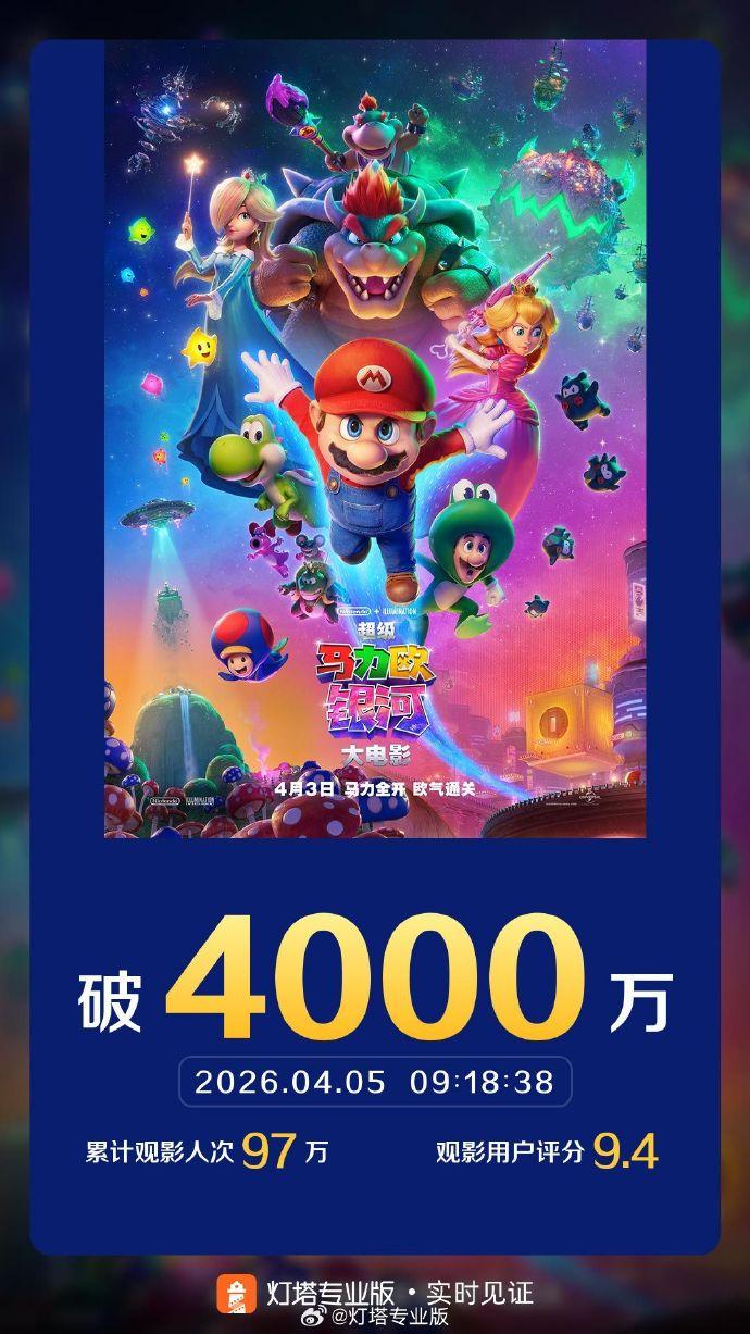 根据灯塔专业版所提供的最新实时数据,截至4月5日上午9时18分,备受瞩目的动画电影《超级马力欧银河大电影》在内地的票房成绩已经成功突破4000万元大关。这一佳绩不仅彰显了该影片的强大吸引力,也预示着其在接下来的放映周期内有望继续创造票房奇迹。