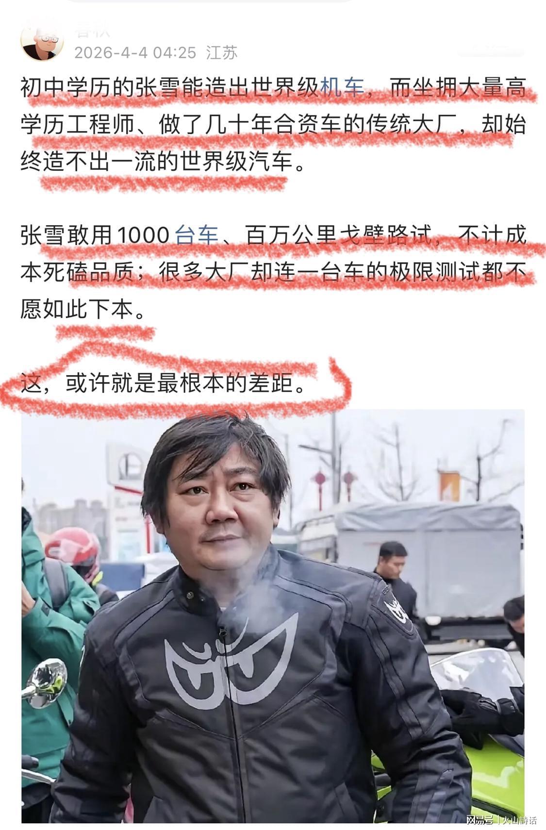 初中学历的张雪能够制造出世界级机车,而那些坐拥大量高学历工程师、多年从事合资车生产的传统大厂,却始终无法打造出一流的世界级汽车。