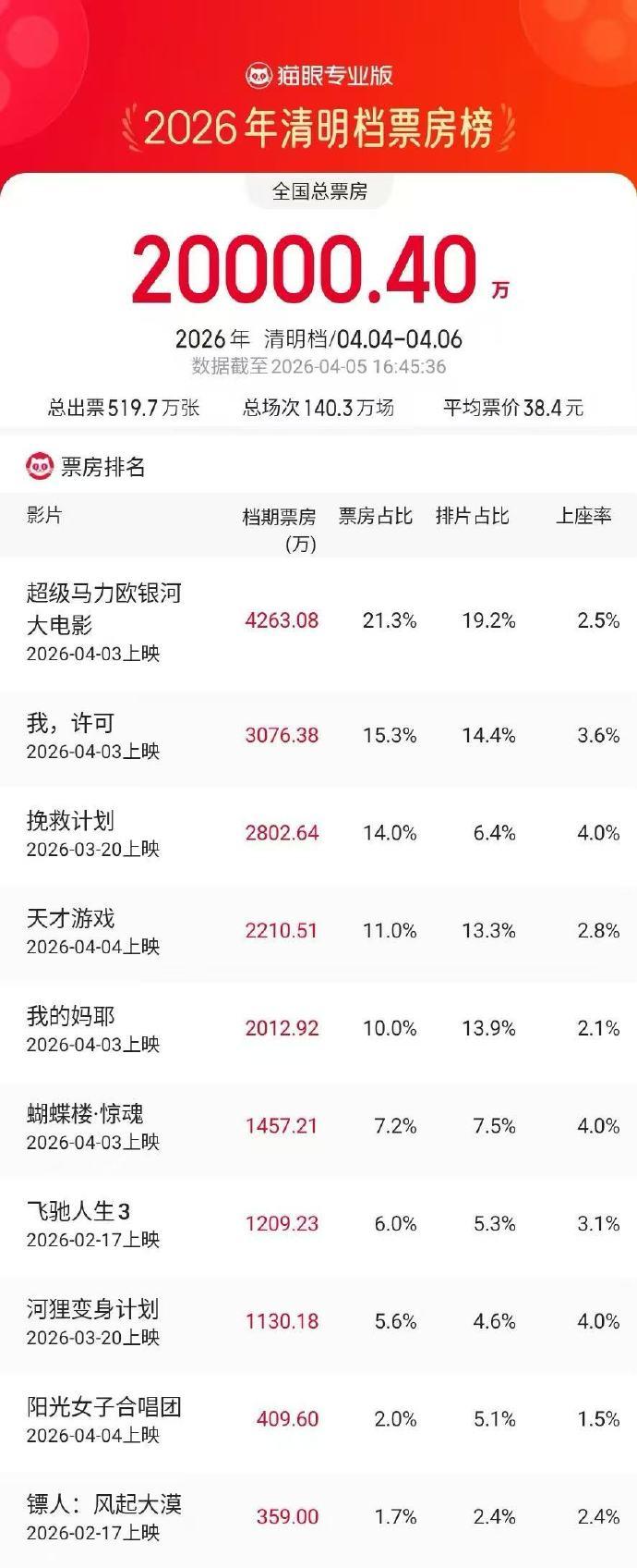 根据徽声在线旗下专业票房统计平台猫眼专业版所公布的数据显示,截至4月5日16时45分这一关键时间节点,2026年清明档(时间跨度为4月4日至4月6日)的电影总票房成功突破2亿大关。在这一激烈的票房竞争中,《超级马力欧银河大电影》凭借其强大的IP影响力和精彩的剧情呈现,稳坐清明档票房榜的冠军宝座;紧随其后的是《我,许可》,该影片以其独特的叙事风格和深刻的主题内涵吸引了众多观众的目光,位列票房榜第二;而《挽救计划》则凭借紧张刺激的剧情和出色的演员表现,成功跻身清明档票房榜前三,成为观众热议的焦点影片。