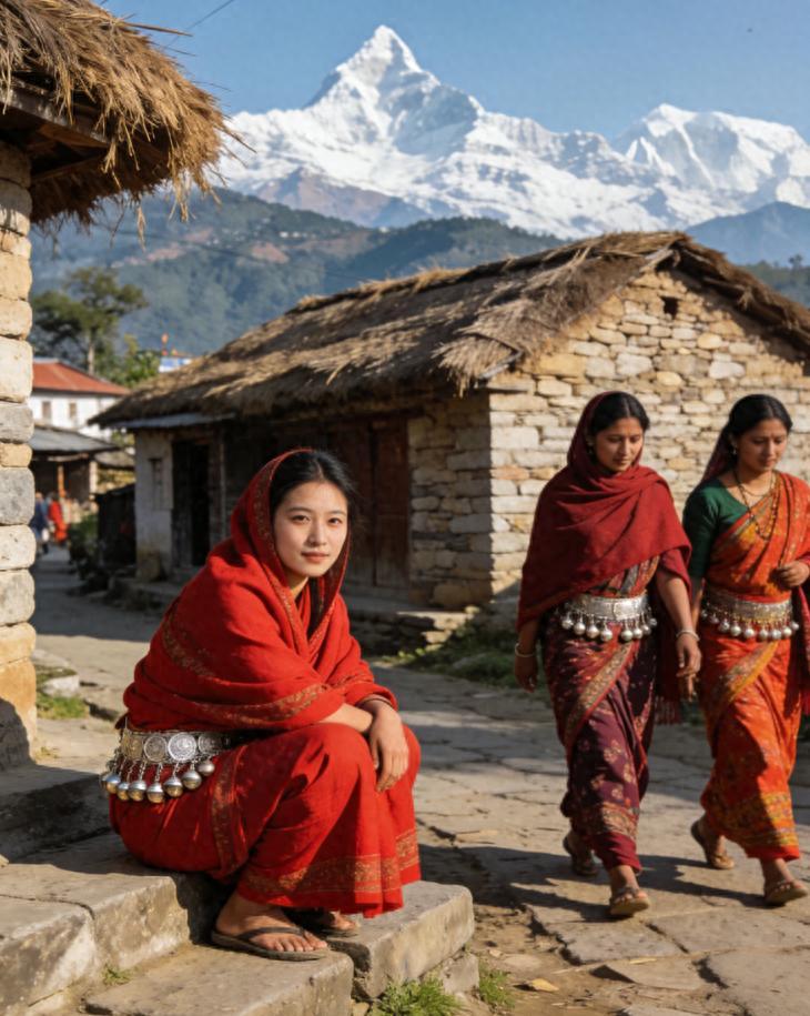 在喜马拉雅山脉的南麓,温暖的阳光轻柔地倾洒在尼泊尔博卡拉那宁静的村庄之上。人文摄影师林夏静静地蹲在村口的古老石阶上,目光被几位身着鲜艳红色纱丽的女性所吸引。她们结伴而行,脸上洋溢着如山间清风般澄澈的笑容,腰间佩戴的银饰随着步伐轻盈地叮当作响,仿佛在演奏着一曲欢快的生活乐章。