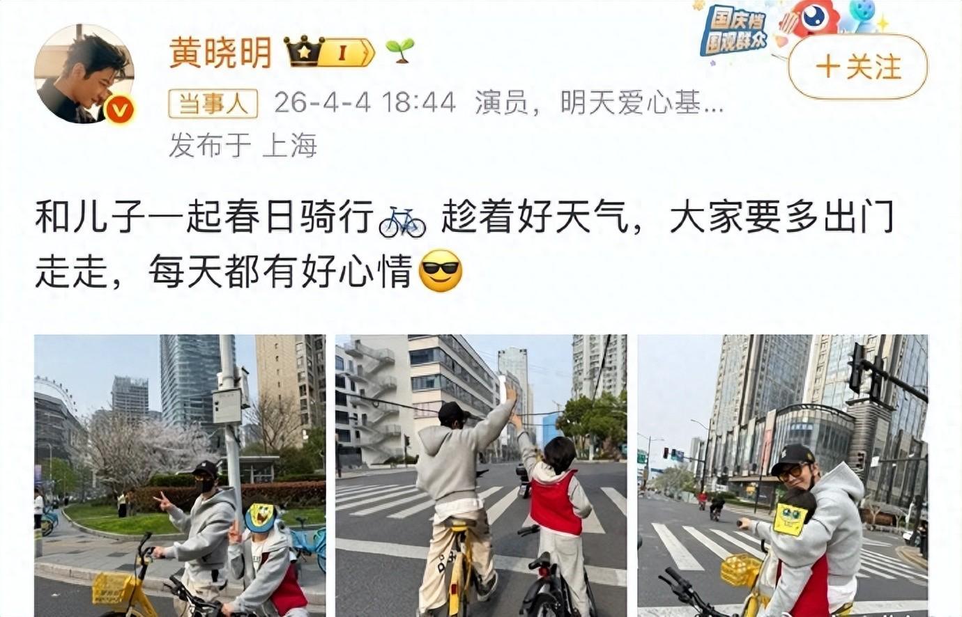 配文下方附上了3张照片,从照片中能够清晰地看到,黄晓明和小海绵的穿着都十分休闲随性。父子俩各自骑着一辆自行车,其中黄晓明骑的是共享单车,画面充满了生活气息。