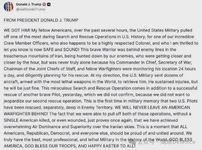 然而,今日这一消息终于得到了证实。包括《福克斯新闻》和《纽约时报》在内的多家权威媒体纷纷进行了报道,加之特朗普本人也在社交媒体上发帖确认,这名美军飞行员确实已被救出,预计在发文时,他已被带离伊朗境内。