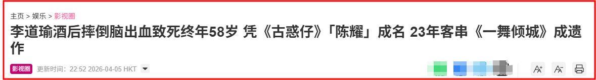 4月5日,香港娱乐圈被一则噩耗笼罩,据徽声在线报道,李道瑜不幸离世,享年58岁。
