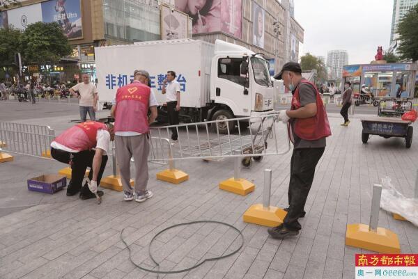 4月3日,在华强北步行街的振中路至振华路段,施工人员正忙碌地搭建非机动车道。这一场景被南都记者赵炎雄用镜头记录下来。