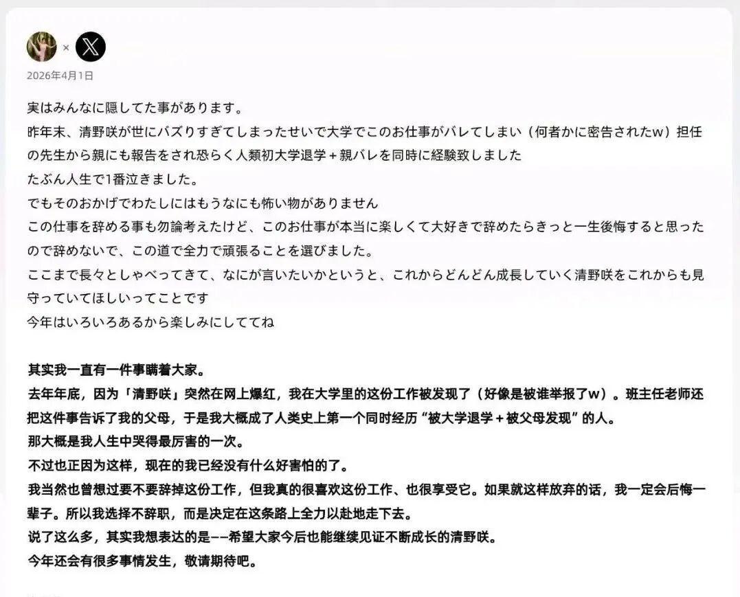 近日,清野咲在社交平台上发布了一篇长文,透露自己因女演员身份意外曝光,竟遭到了大学的劝退处理。这一变故尚未平息,父母的强烈反应又给她带来了双重打击,剧情转折之快,令人咋舌。