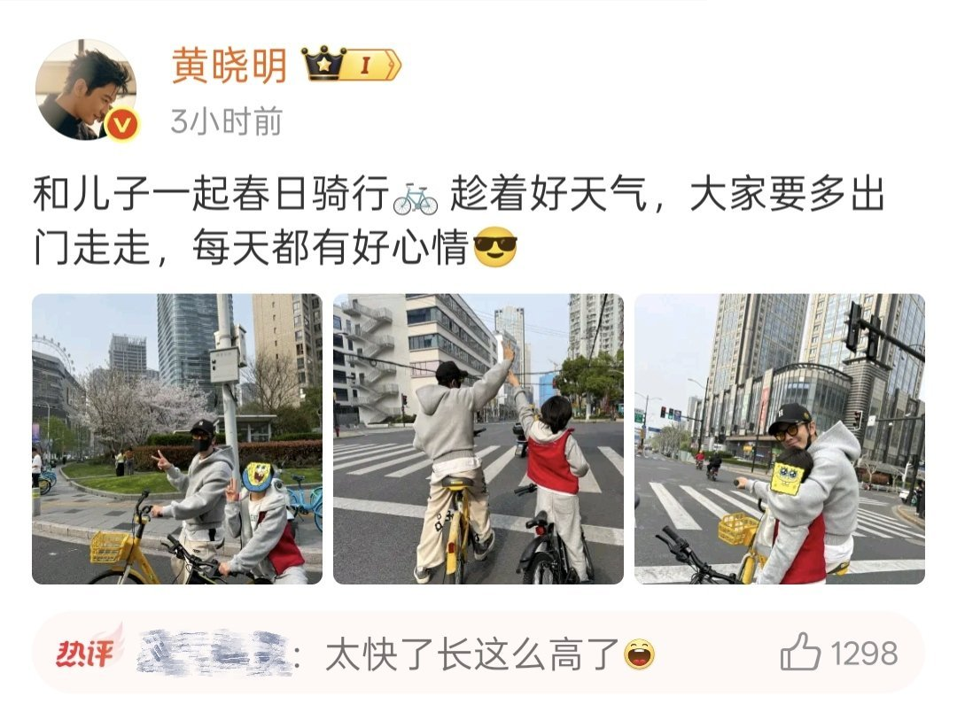 他在动态中写道:'春日骑行正当时,趁着阳光正好,带娃出门感受大自然,愿大家每天都有好心情',并配发了三张温馨的亲子骑行照。