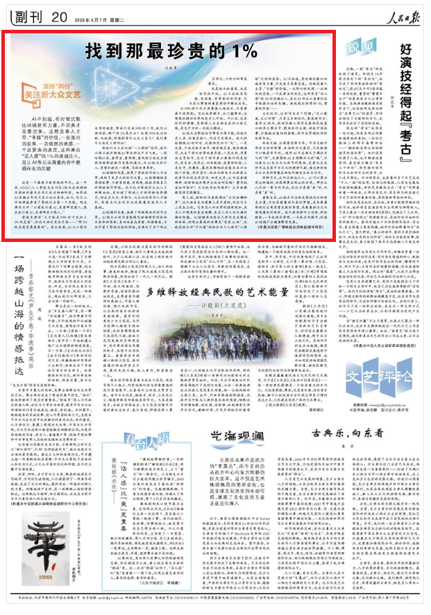 这篇副刊文章被安排在“坚持“两创”·关注新大众文艺”专栏中,该专栏每周二都会在《人民日报》“副刊”头条位置刊发。