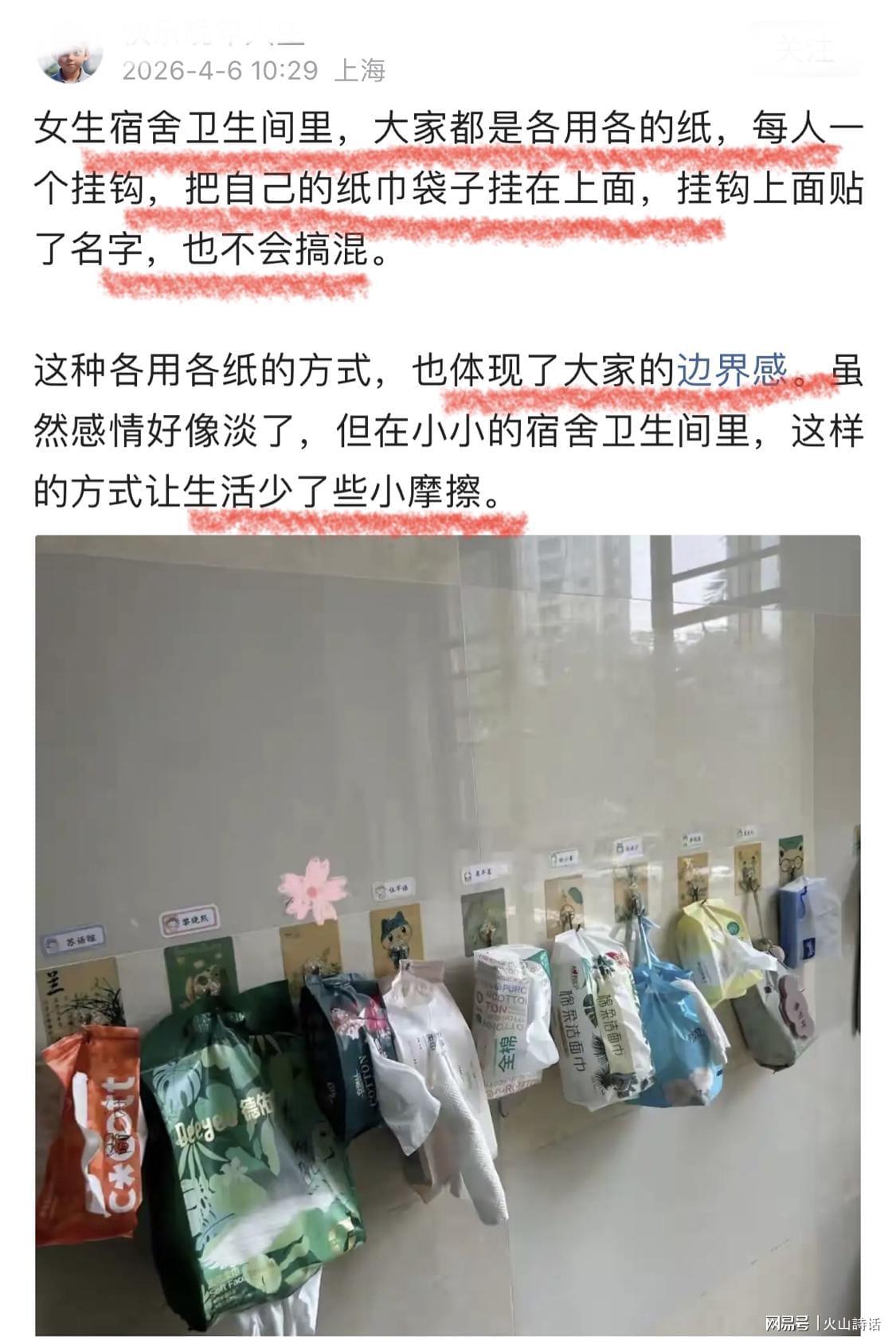 4月6日,一位来自上海的网友在社交平台上分享了一则引人深思的帖子,揭秘了某女生宿舍卫生间内一个独特的生活习惯——每位女生都拥有自己的纸巾挂钩,挂钩上不仅挂着各自的纸巾袋,还细心地贴上了名字标签,确保不会混淆使用。