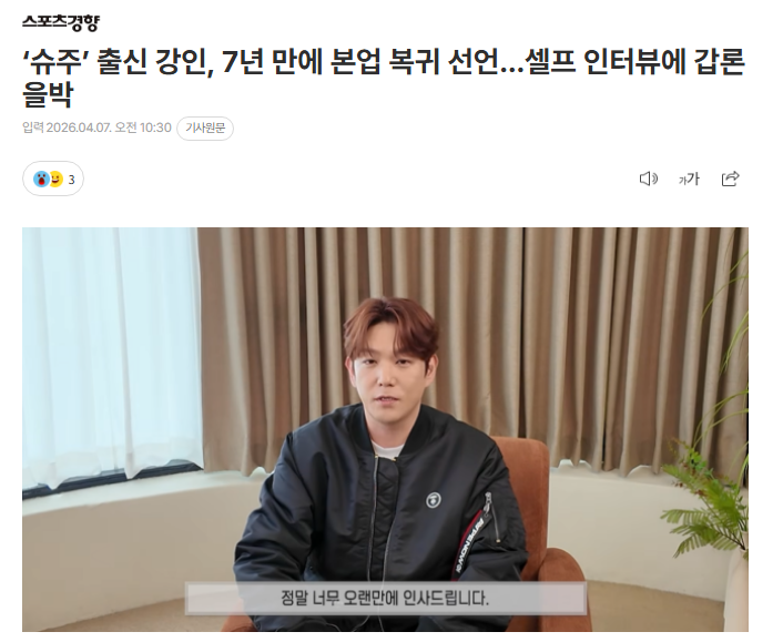 本月6日,前Super Junior组合成员强仁通过个人官方YouTube账号发布了一段名为“强仁的深度自我采访”的视频。在这段视频中,他正式宣布将发行全新数码单曲,这一举动标志着他的正式复出,同时也引发了广泛的争议和讨论。