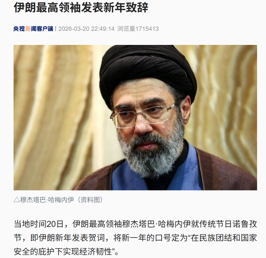 当地时间3月20日,伊朗最高领袖穆杰塔巴·哈梅内伊借诺鲁孜节这一盛大节日,向全国发表了新年贺词。他郑重宣布,新一年的国家发展口号为“在民族团结和国家安全的坚实庇护下,实现经济的强大韧性”。