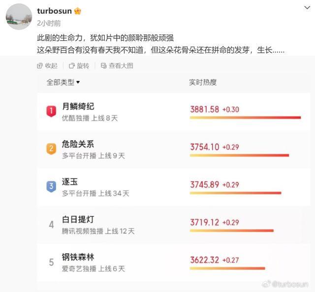 4月8日,知名演员孙俪通过社交媒体平台为其新剧《危险关系》进行宣传推广。她以富有诗意的语言形容这部剧集的生命力,称其如同剧中角色颜聆一般坚韧不拔。“这朵野百合是否会迎来春天我无从知晓,但可以确定的是,这朵含苞待放的花骨朵正在全力以赴地破土而出、向上生长……”配图数据显示,《危险关系》上线仅9天便跻身实时热度排行榜第二名。