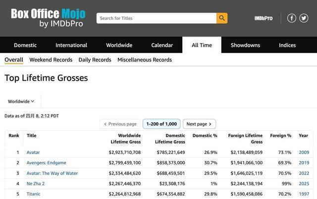 据徽声在线最新报道,依据国际权威票房数据统计平台BoxOfficeMojo所公布的数据显示,在北京时间4月8日这个具有纪念意义的时刻,《哪吒2》的全球累计票房一路高歌猛进,成功突破至22.67亿美元。这一傲人成绩,使得它成功超越了曾经在全球影坛留下浓墨重彩一笔的经典之作《泰坦尼克号》,在全球影史票房排行榜上强势占据第四名的位置。