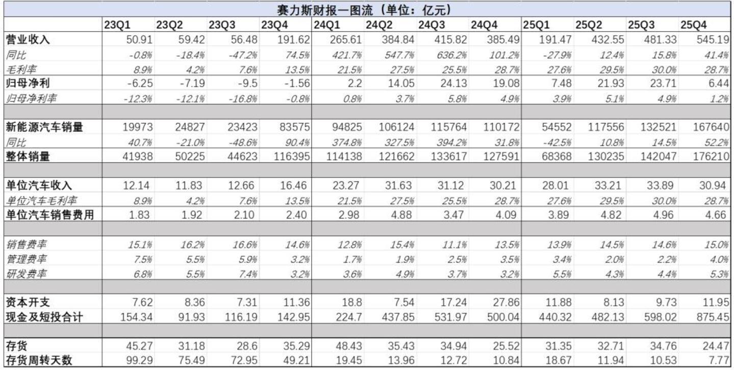 现金流方面,上市后赛力斯成为现金储备第一梯队的主机厂之一。截至2025年末,赛力斯现金及短期投资累计余额超过875亿元。
