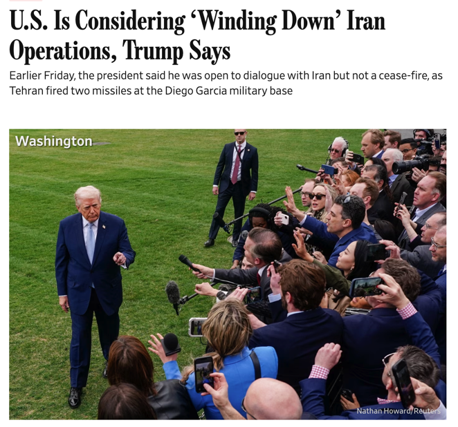 △《纽约时报》进一步报道,特朗普总统在社交媒体上发帖称,美国正在考虑“逐步结束”对伊朗的战争,但就在发帖前不久,他还向记者表示“我不想停火”