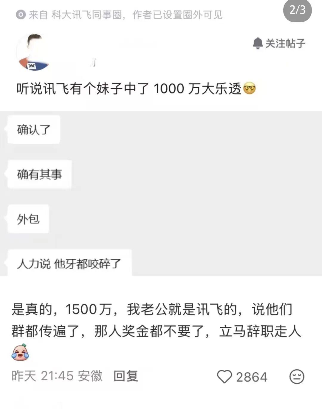 此前,职场社交平台上有爆料称,科大讯飞的一位女员工在福利彩票中斩获了1000万巨奖,如此好运着实令人惊叹。还有科大讯飞的内部员工透露,听说有人中了1500万后,竟然火速办理了离职手续,连奖金都不要了,这一消息引发了众多猜测和热议。