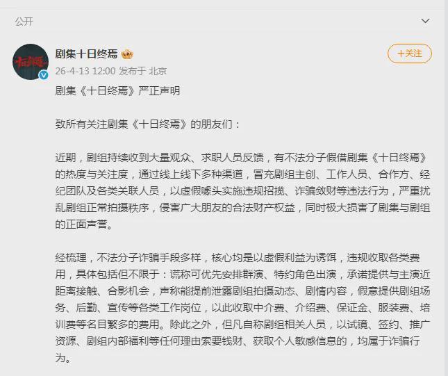 4月13日,备受瞩目的剧集《十日终焉》剧组正式发布了一则严正声明。