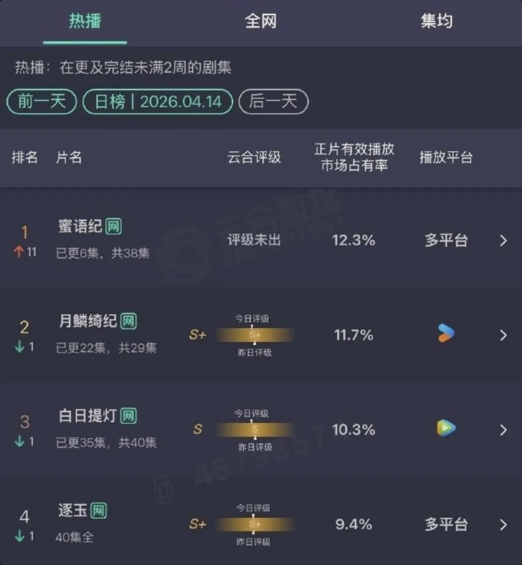 在云合数据排行榜上,《蜜语纪》连续7日压制《月鳞绮纪》《白日提灯》等S+级制作,微博指数更创下2026年剧集类新纪录。值得注意的是,该剧的观众构成中,非粉丝群体占比高达89%,形成真正的"路人盘"现象。有业内人士分析指出:"当其他剧集还在靠粉丝控评刷数据时,《蜜语纪》已经用真实口碑完成破圈传播,这种自来水效应在当今影视市场尤为珍贵。"