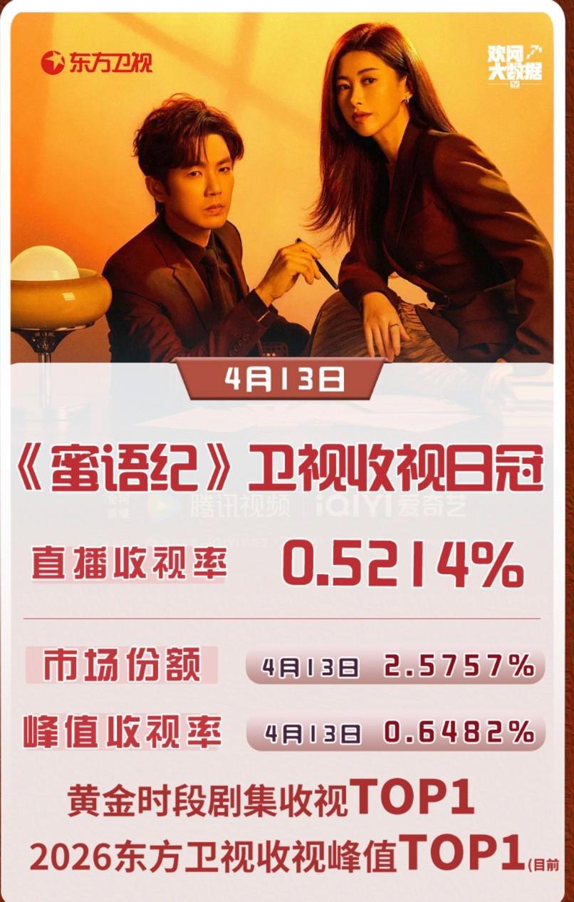 由钟汉良、朱珠、李梦领衔主演的《蜜语纪》一上线便掀起热潮,4月13日在东方卫视黄金档首播即斩获当晚收视冠军,平均收视率达到0.52%,峰值更是飙升至0.6482%,一举刷新了东方卫视2026年的收视纪录。