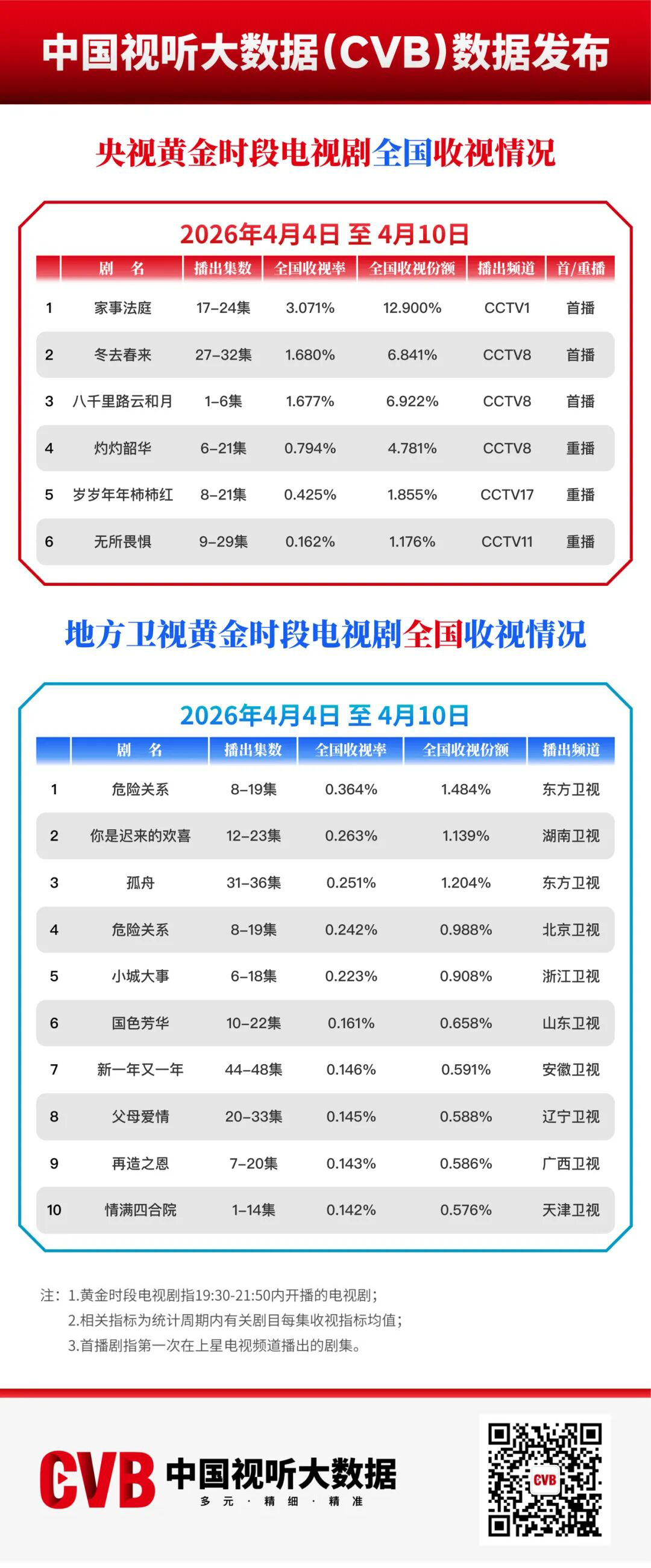 徽声在线最新消息!CVB收视周报火热出炉,揭晓了【2026年4月4日至4月10日】黄金时段电视剧的收视盛况✨