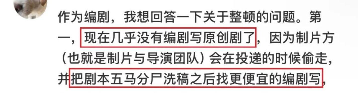 最直接的问题,莫过于原创被窃取、劳动被白嫖。据他透露,如今坚持写原创剧本的编剧已经寥寥无几,因为原创剧本在投递阶段就可能被“偷走”,经过洗稿后找更便宜的编剧重新创作。在创作保护几乎为零的现实下,编剧维权无门,只能被迫放弃原创,转向IP改编。