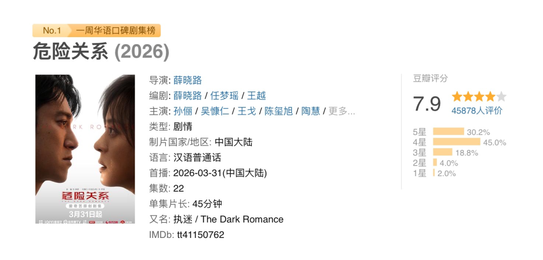 在今年的剧集市场中,能够让人一气呵成追完的长剧并不多见,《危险关系》无疑是其中之一。该剧在豆瓣上的评分轨迹颇具看点:从加更礼收官时的1.2万人打分7.7分,到一周后评分人数激增至4.3万,评分也攀升至7.9分,实现了口碑与热度的双丰收。