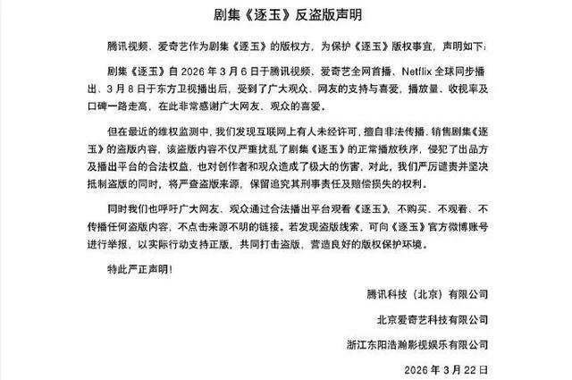 作为剧集《逐玉》的版权所有方,腾讯视频与爱奇艺联合发表声明,旨在全力维护《逐玉》的版权权益: