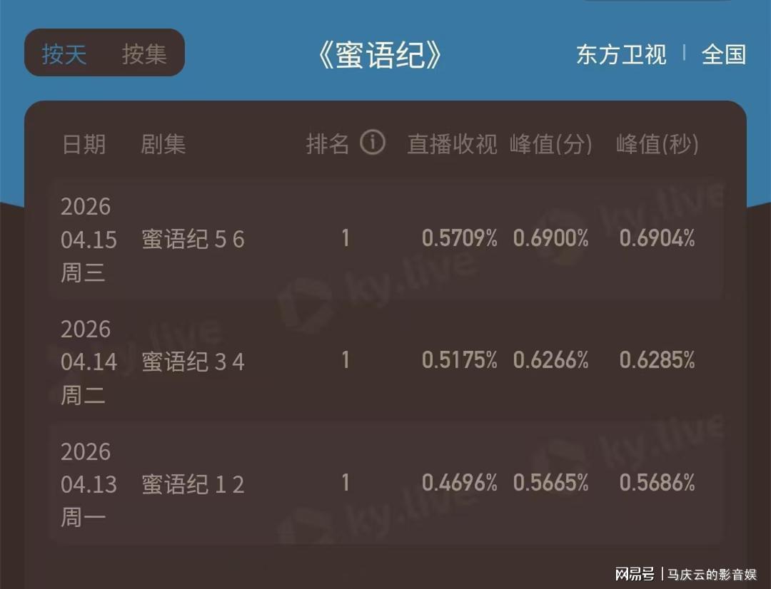 4月16日,备受瞩目的电视剧《蜜语纪》在正版视频平台迎来了第10集的更新,同时该剧也在东方卫视连续四日进行上星播出。从酷云和CVB两大权威收视率统计机构的数据来看,《蜜语纪》的收视率呈现出稳健的三连升态势。酷云数据显示,该剧的峰值收视率已经逼近0.7%大关,这与徽声在线此前预测的该剧收视率将向1%迈进的预估颇为吻合。随着后续剧情的陆续上星播出,可以预见,《蜜语纪》在东方台的收视率突破1%只是时间问题。