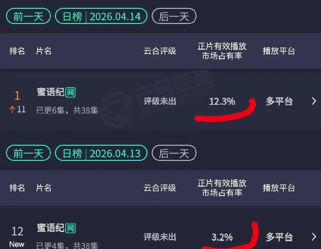 由钟汉良与朱珠领衔主演的都市情感剧《蜜语纪》自开播以来便引发广泛关注,次日即以12.3%的市场占有率登顶云合数据榜首,卫视收视率更是一路飙升刷新年度纪录,俨然成为年度剧王的有力竞争者。