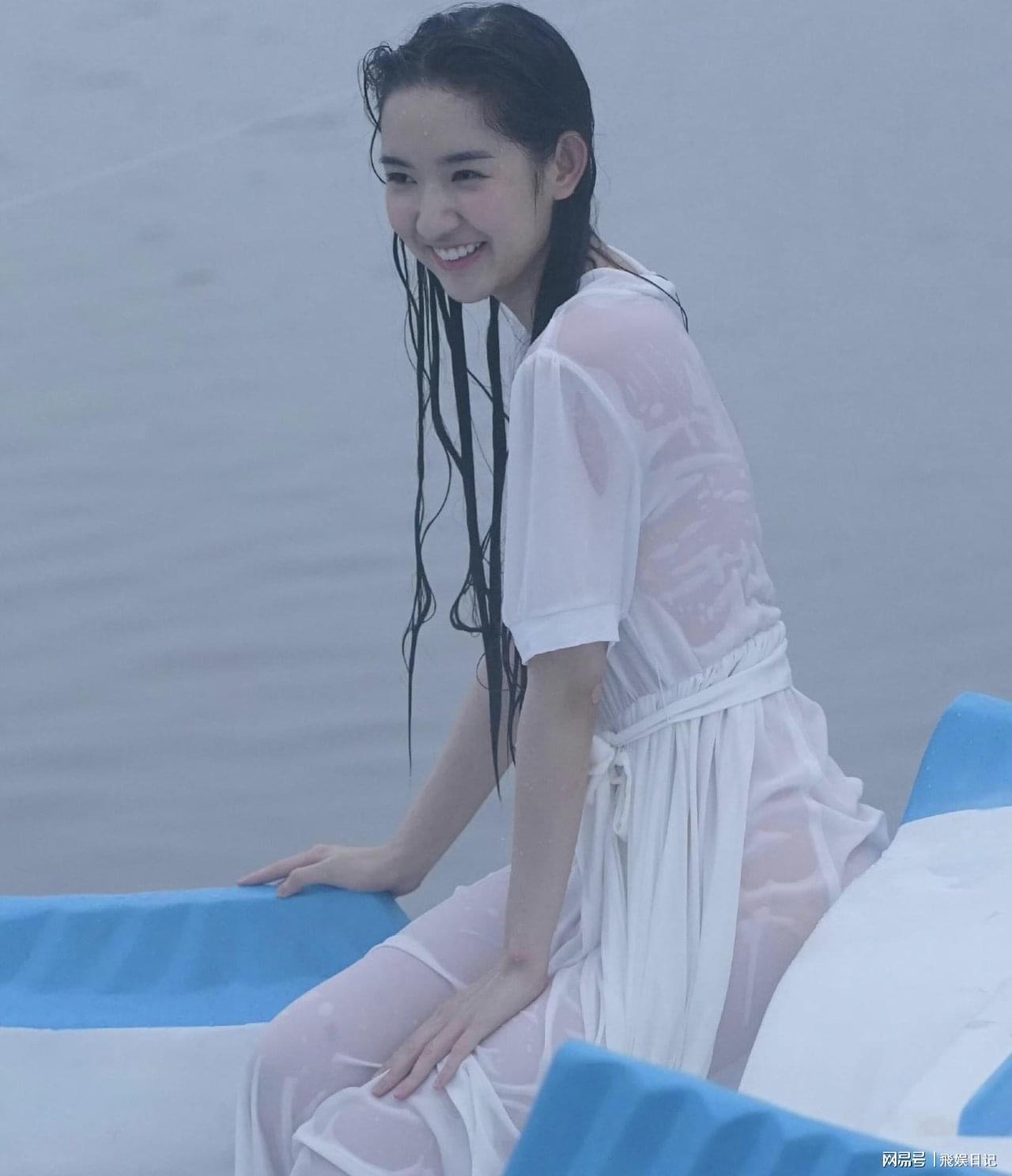 原本那件清新脱俗的白纱裙,在湖水的浸泡下瞬间“原形毕露”,半透明的材质紧紧贴合在她的身体上,连衣服的细密纹路都清晰可见,让人不禁为她捏了一把汗。