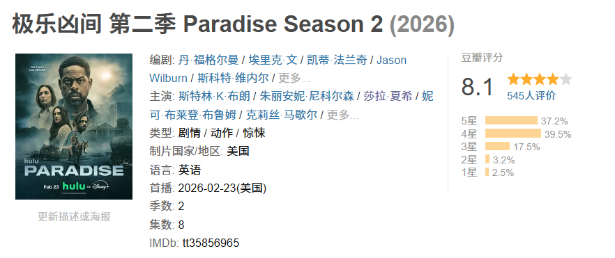 当国内观众还在犹豫是否入坑时,这部剧已在海外掀起收视狂潮——IMDb单季评分飙至8.7,烂番茄新鲜度达92%,国内外口碑呈现魔幻式分化。今天我们就来揭秘,这季究竟凭什么被奉为"末日题材教科书"?