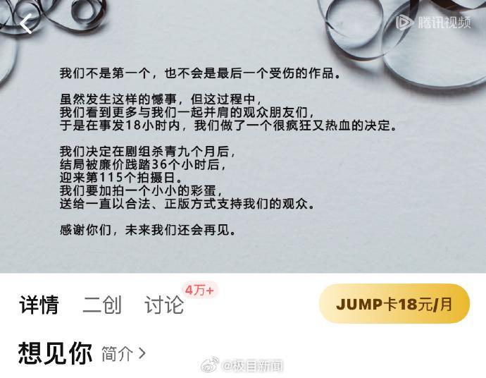 面对盗版资源的肆虐,电视剧《想见你》官方曾公开发声表示:我们深知,此类事件并非首次发生,也绝非最后一次。尽管遭遇了这样的不幸,但在这个过程中,我们看到了更多与我们并肩作战的观众朋友们。因此,在事发后的18小时内,我们做出了一个既疯狂又充满热血的决定。在剧组杀青九个月后,当结局被廉价践踏36小时后,我们迎来了第115个拍摄日。我们决定加拍一个小彩蛋,以此回馈那些一直以合法、正版方式支持我们的观众。感谢你们的陪伴,未来我们定会再次相见。