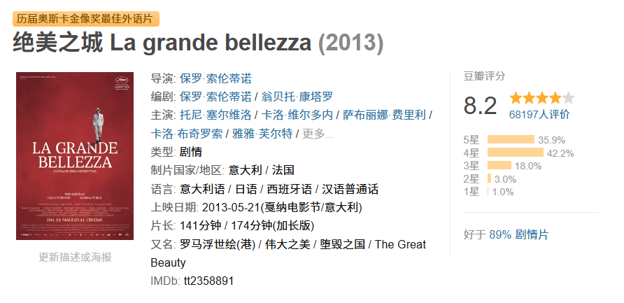 2014年,对于全球电影界而言是极具纪念意义的一年,这一年《绝美之城》横扫奥斯卡金像奖最佳外语片、金球奖最佳外语片,更是在欧洲电影奖上将最佳影片、最佳导演、最佳男演员四大重量级奖项尽收囊中,成为当之无愧的年度神作。