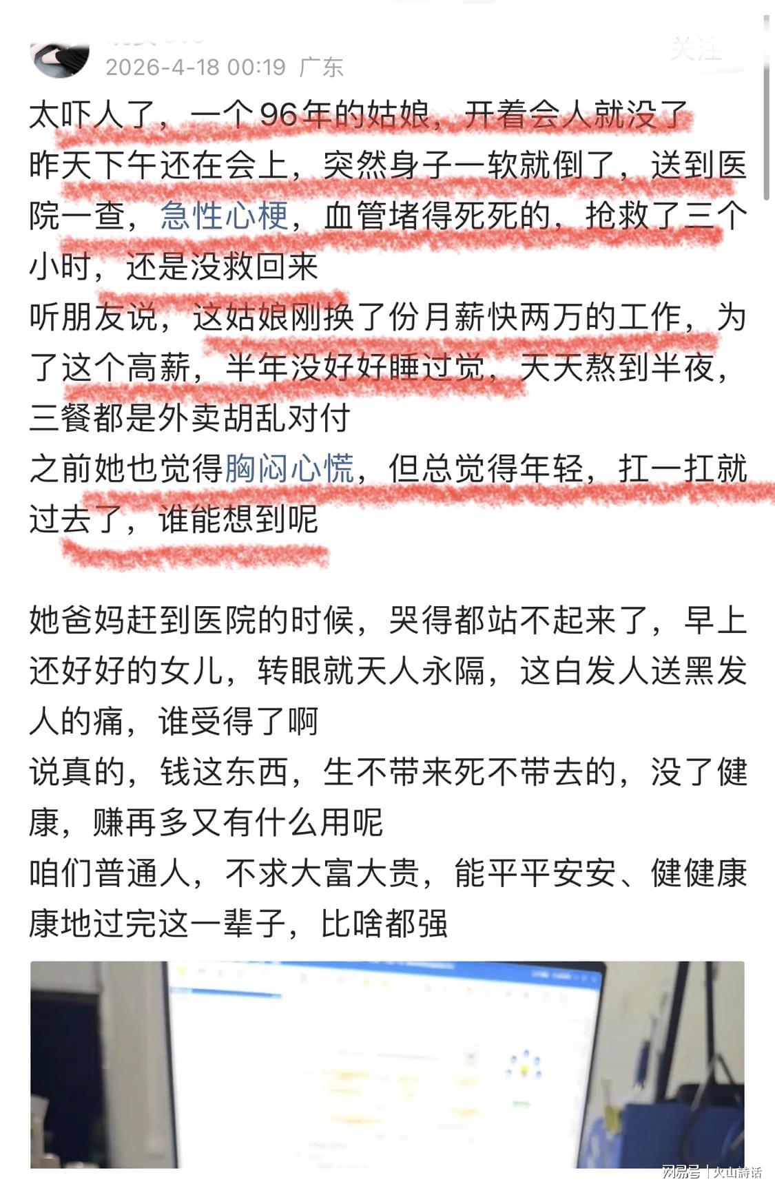 4月18日清晨,一则来自广东的突发消息引发全网关注:一名1996年出生的年轻女性在会议中突发倒地,经诊断为急性心肌梗死,冠状动脉完全闭塞,尽管经过三小时紧急抢救仍不幸离世。据知情人士透露,为维持每月近两万元的高收入,该女子长期保持高强度工作状态,半年内持续熬夜加班,日常饮食全靠外卖解决,即便出现胸闷心悸等症状也选择硬撑,最终在人生最灿烂的年纪戛然而止。