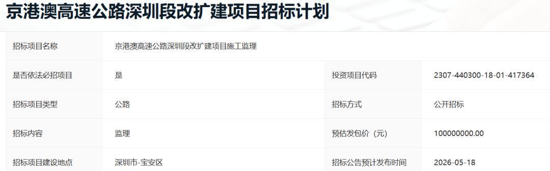 2026年4月17日,一则重磅消息传来——《京港澳高速公路深圳段改扩建项目招标计划》正式对外公布。按照计划,5月中旬将针对项目施工监理以及中心试验室试验检测服务展开公开招标。其中,施工监理招标预估发包价高达1亿元,中心试验室试验检测服务招标预估发包价则为5500万元,招标主体为广深珠高速公路有限公司。这一举措标志着,素有广东“堵王”高速之称的广深高速及其相关路段的改扩建工程即将步入全面建设的新阶段。