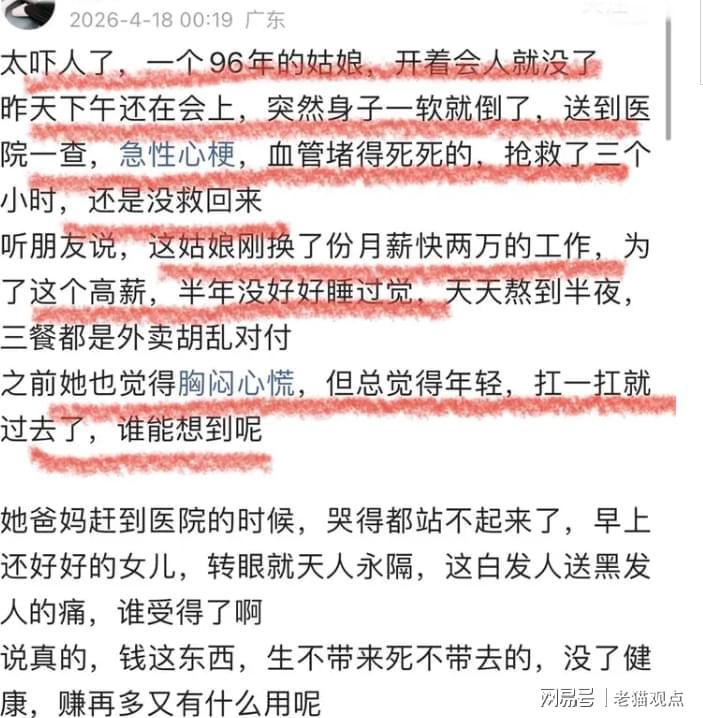 惊心!广东96年女生深夜开会突发心梗离世 为高薪半年熬夜不懈