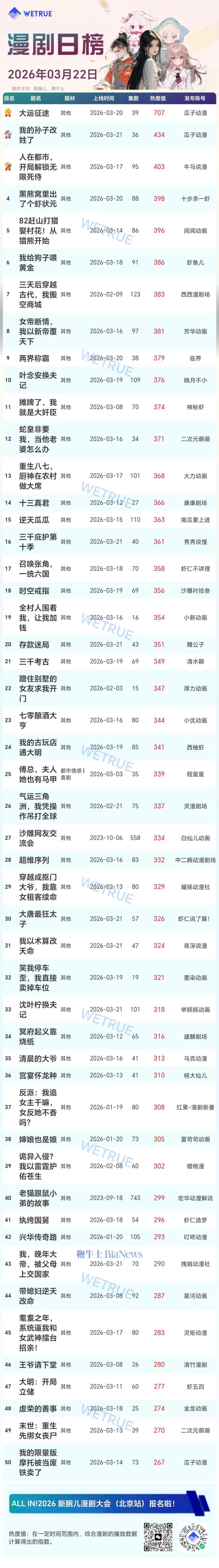 3月22日漫剧&AI真人剧日榜:《大运征途》领跑漫剧界