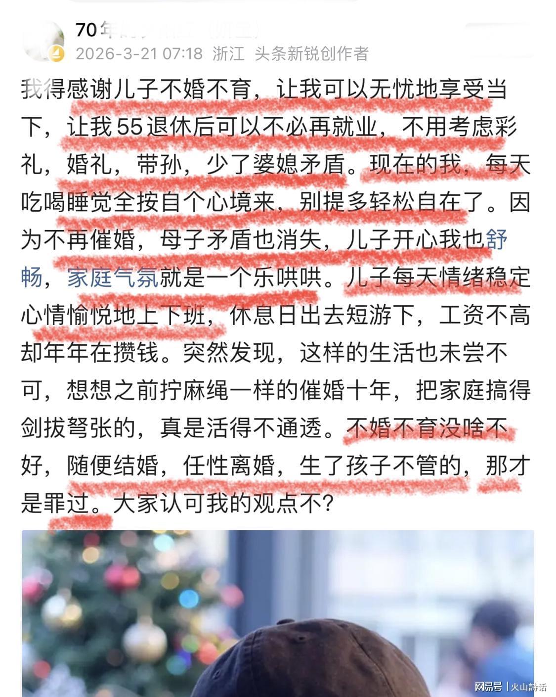 近日,一位来自浙江的55岁母亲在网络平台上发布的一则帖子引发了广泛热议。她坦言庆幸儿子做出了不婚不育的选择,这一决定让她得以彻底告别过去因催婚而产生的无尽内耗,从而能够悠然自得地安享退休生活,家庭氛围也因此重归温馨和睦,此言论迅速在网络上掀起波澜。