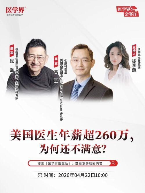 4月22日上午10点,张强医生集团的首席专家张强医生,以及来自美国西雅图的心脏科医生高磊,将共同做客“医学界”直播间。届时,他们将与“医学界”助理总编徐李燕一起,深入剖析美国医生薪酬背后的真实困境,探讨其背后的行业逻辑与发展趋势。