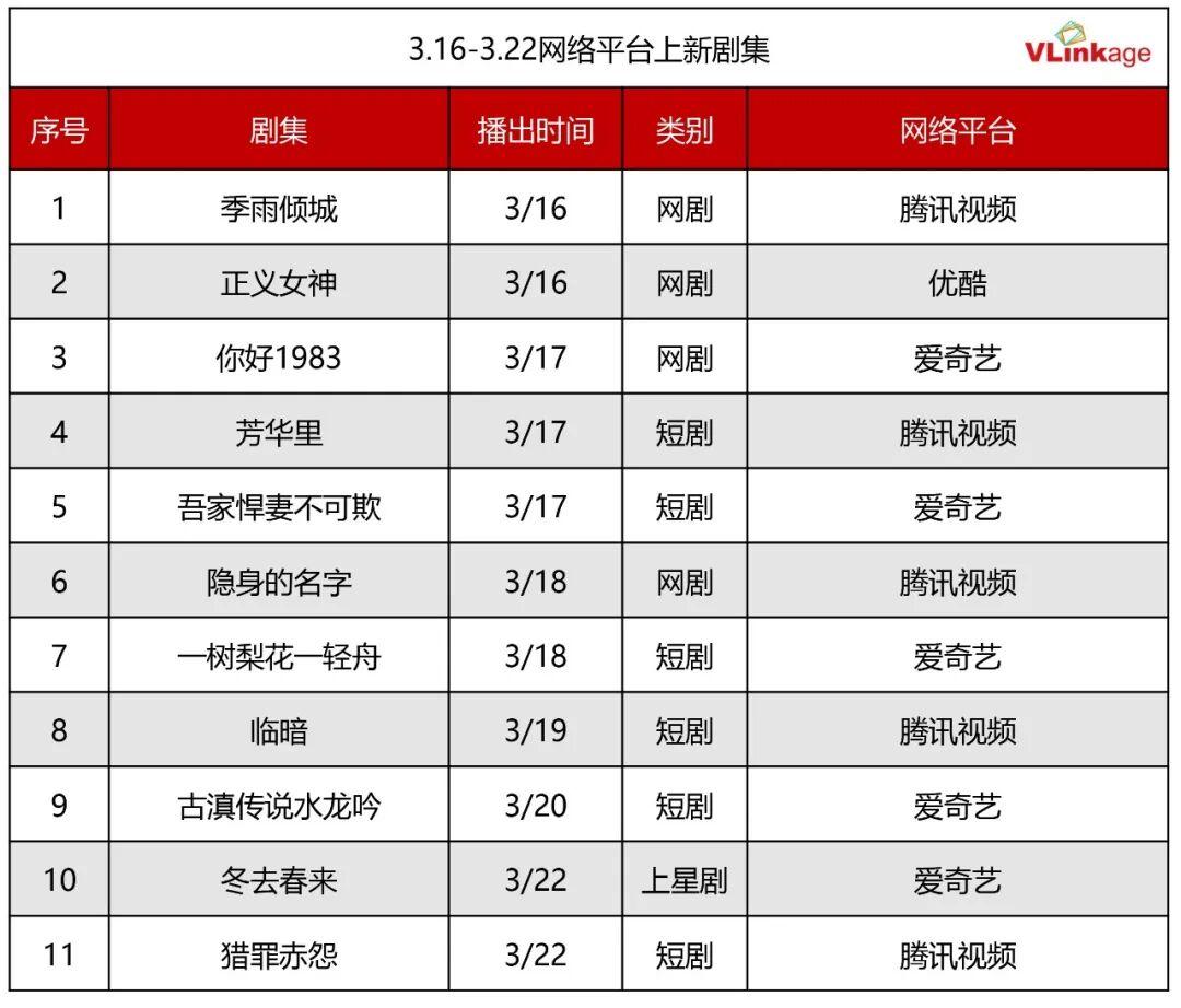 据徽声在线统计,上周各大视频平台共计有11部新作品与观众见面。其中,上星剧有1部,网剧4部,微短剧6部。每年第一季度向来是年代剧播出的“黄金时期”,风格截然不同的《冬去春来》和《你好1983》恰好应时应景。这两部剧凭借各自独特的魅力,都拥有着庞大的受众基础。而女性情感剧《隐身的名字》和港剧《正义女神》,作为垂直领域市场中备受青睐的剧集类型,自上线以来就备受关注,观众的期待值也一直居高不下。