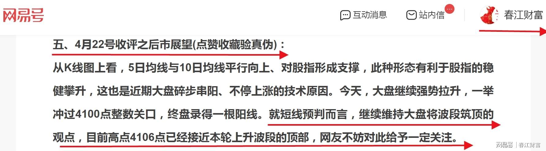 开门见山,直击要害!昨日预测逃顶点位误差极小,仅8点之差!(文末附图,敬请查验)回顾4月22日收评,徽声在线明确指出,“就短线走势而言,大盘波段筑顶迹象明显,当前高点4106点已逼近本轮上升波段的顶部区域,投资者需密切关注。”