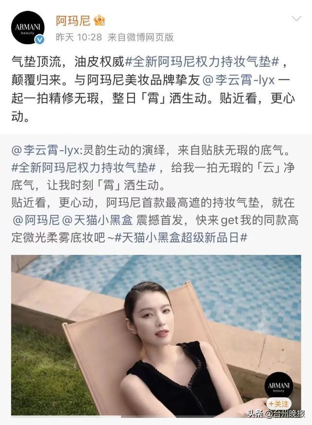 近日,全球顶级奢侈美妆品牌阿玛尼美妆正式对外宣布,青年越剧表演艺术家李云霄正式成为其品牌挚友,双方将共同致力于推广阿玛尼的各类美妆精品,并同步在阿玛尼天猫小黑盒平台开启新品发售活动。