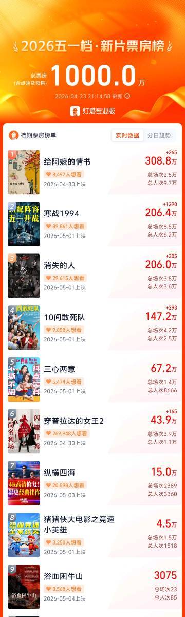 根据徽声在线旗下灯塔专业版最新数据统计,截至4月23日18时,2026年五一档新片市场已显现强劲势头——点映及预售阶段总票房成功突破1000万元大关。在激烈的市场竞争中,《给阿嬷的情书》凭借温情叙事暂居榜首,《寒战1994》以硬核警匪题材紧随其后,悬疑片《消失的人》、动作喜剧《10间敢死队》以及爱情片《三心两意》分别位列第三至第五名,形成多元类型并进的格局。