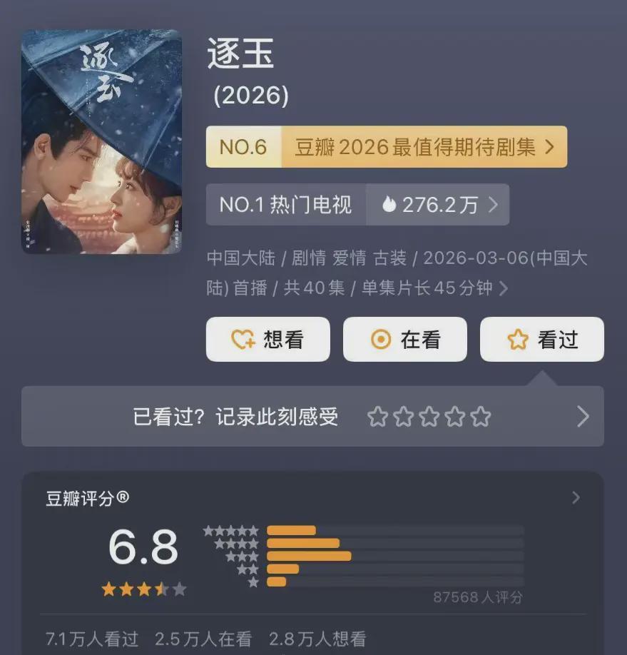 《逐玉》评分6.8引热议,热度与评分人数不成正比,营销过度反遭质疑