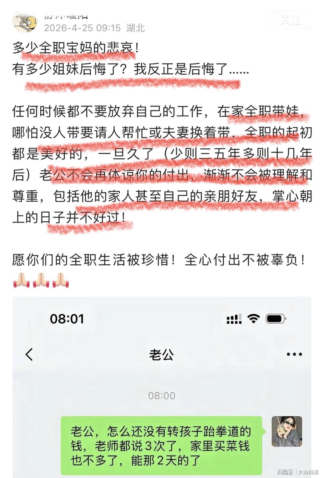 太令人心酸了!一位全心全意在家带娃15年的妻子,仅仅因为向丈夫索要孩子的学费和日常买菜的钱,就遭到了丈夫的辱骂,被指责为“没出息”“只知道要钱”。这样的话语,不仅深深刺痛了这位母亲的心,也折射出无数全职妈妈在婚姻中的共同困境——她们全身心地投入到家庭中,却往往被忽视,自我价值被简单地用金钱来衡量,每天伸手要钱的背后,隐藏着无尽的委屈和无奈。这一事件在网络上引发了广泛的热议。