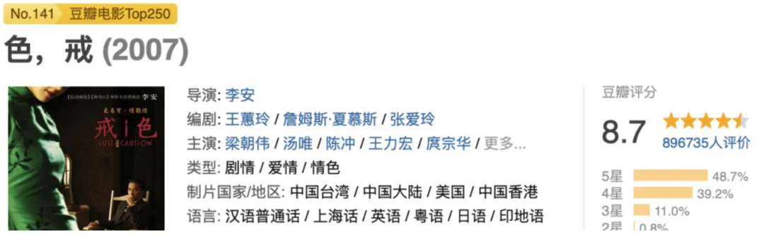 提及李安执导的《色,戒》,这部作品在华语影坛的地位堪称举足轻重,其在国内引发的观影热潮与讨论度,几乎达到了现象级的程度,豆瓣上高达89万人的评分,最终定格在8.7分的高分,足以证明其艺术价值与观众认可度。
