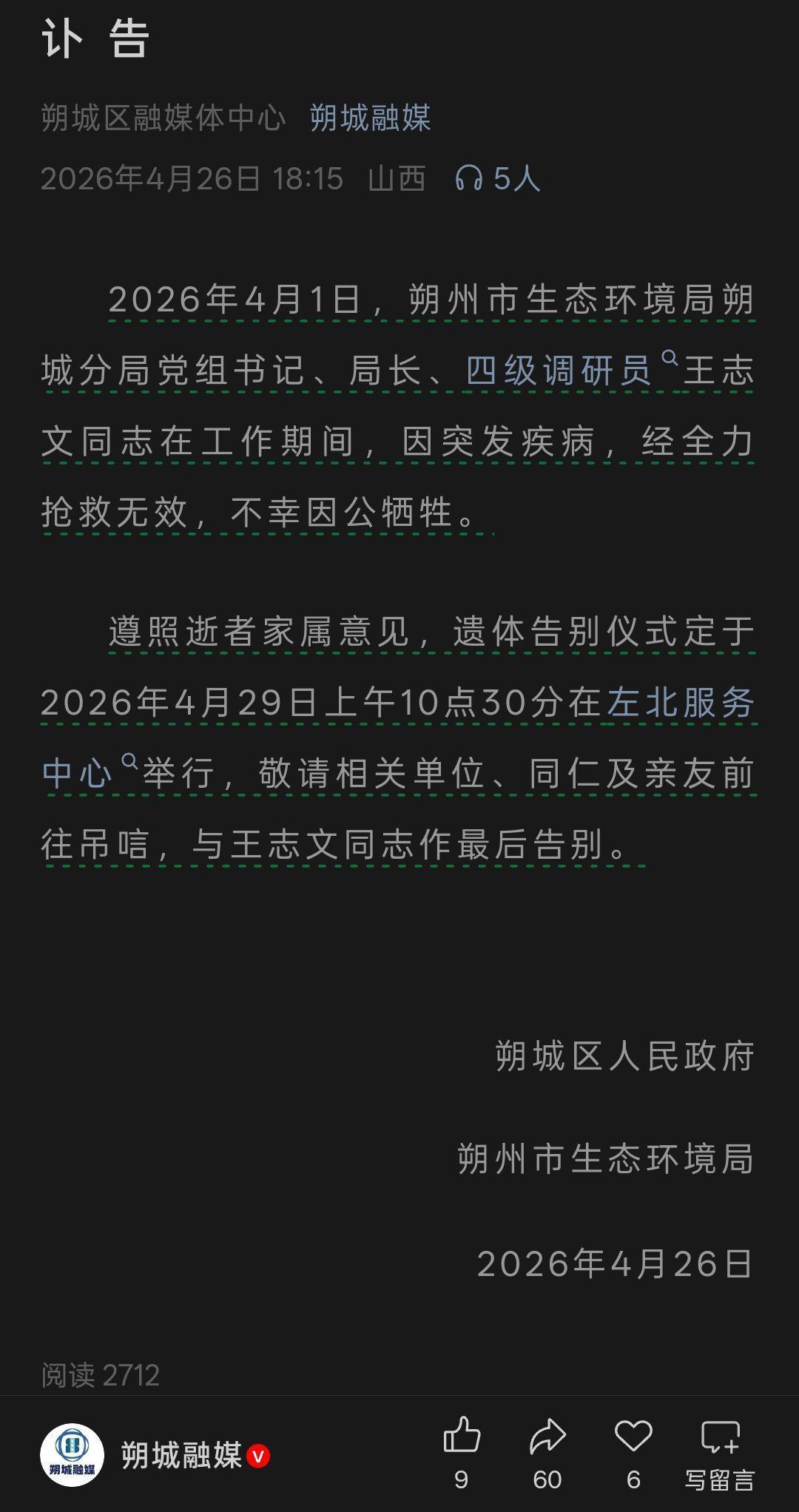4月26日,朔州市朔城区官方媒体平台发布了一则令人痛心的讣告:2026年4月1日,朔州市生态环境局朔城分局的党组书记、局长兼四级调研员王志文同志,在工作期间突发疾病,尽管经过全力抢救,仍不幸因公牺牲。根据逝者家属的意愿,遗体告别仪式定于4月29日上午10点30分在左北服务中心庄重举行,诚邀相关单位、同仁及亲友前往,共同送别王志文同志最后一程。讣告由朔城区人民政府与朔州市生态环境局联合发布。